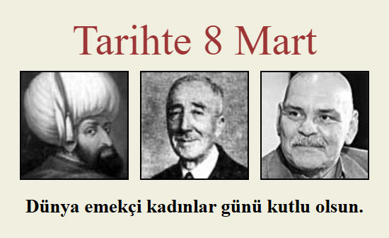 1857 - ABD’de kadın işçiler büyük bir yürüyüş düzenlendi. 1975 yılında Birleşmiş Milletler bu günü "Dünya Emekçi Kadınlar Günü" ilan etti.