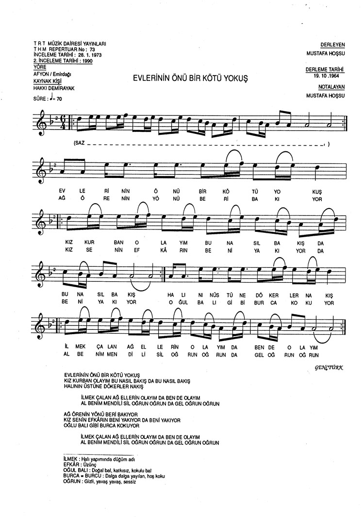 Bu türkünün notasında, sözlerinde veya örnek icrasında bir eksiklik yahut yanlışlık tespit ederseniz, e-mail ile veya WhatsApp hattından bildirim yaparak katkıda bulunabilirsiniz.