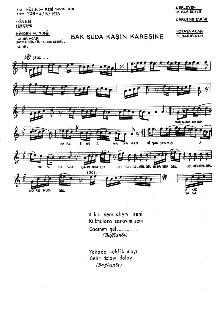 Bu türkünün notasında, sözlerinde veya örnek icrasında bir eksiklik yahut yanlışlık tespit ederseniz, e-mail ile veya WhatsApp hattından bildirim yaparak katkıda bulunabilirsiniz.