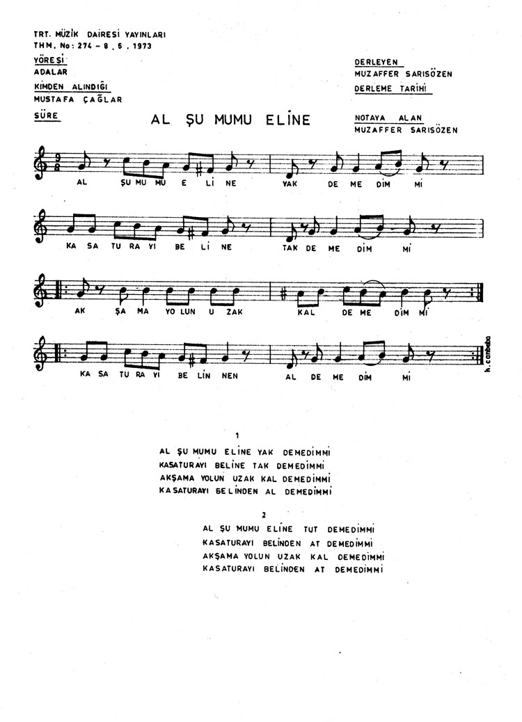 Bu türkünün notasında, sözlerinde veya örnek icrasında bir eksiklik yahut yanlışlık tespit ederseniz, e-mail ile veya WhatsApp hattından bildirim yaparak katkıda bulunabilirsiniz.