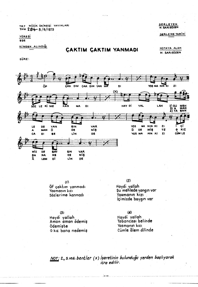 Bu türkünün notasında, sözlerinde veya örnek icrasında bir eksiklik yahut yanlışlık tespit ederseniz, e-mail ile veya WhatsApp hattından bildirim yaparak katkıda bulunabilirsiniz.