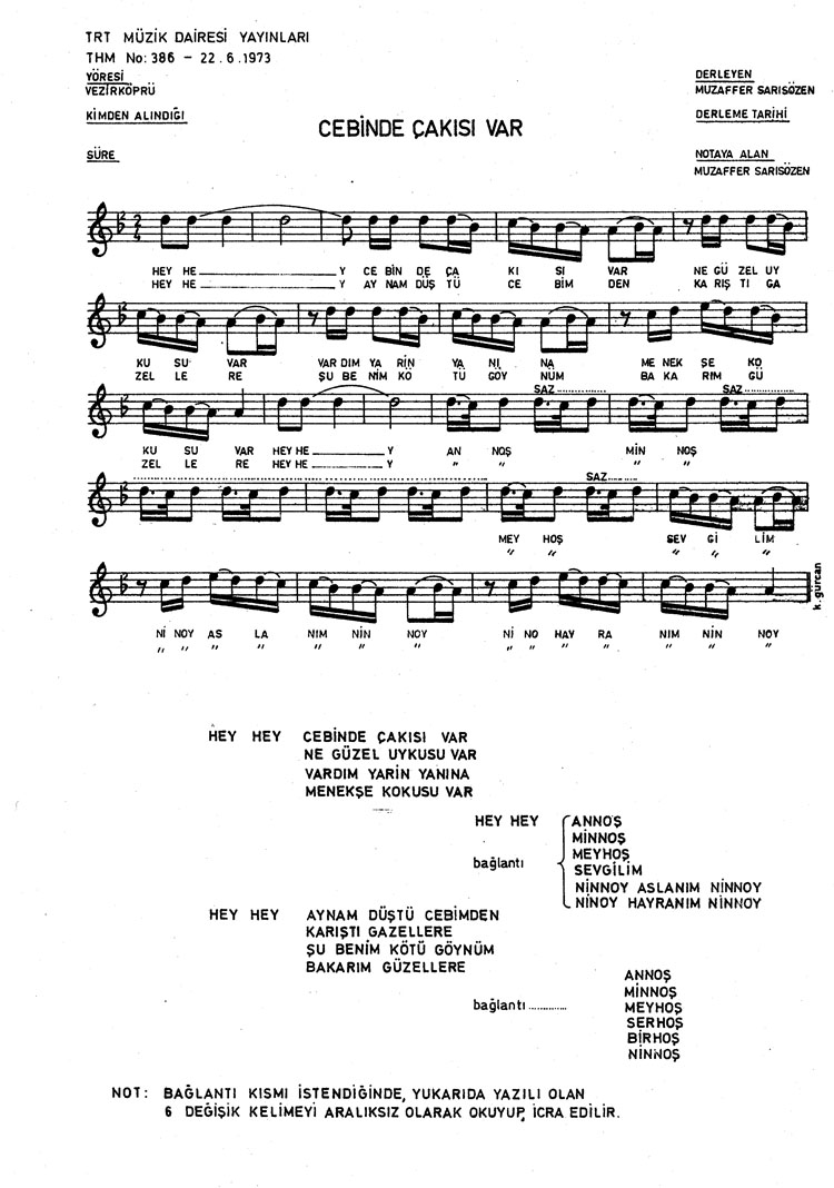 Bu türkünün notasında, sözlerinde veya örnek icrasında bir eksiklik yahut yanlışlık tespit ederseniz, e-mail ile veya WhatsApp hattından bildirim yaparak katkıda bulunabilirsiniz.