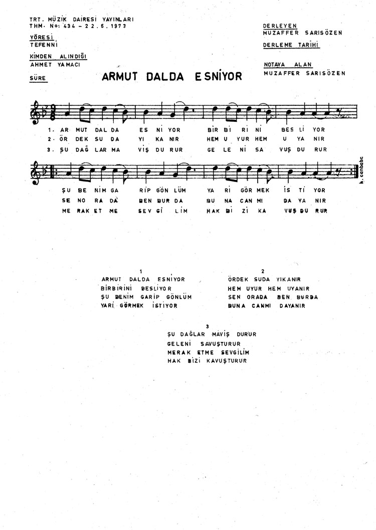 Bu türkünün notasında, sözlerinde veya örnek icrasında bir eksiklik yahut yanlışlık tespit ederseniz, e-mail ile veya WhatsApp hattından bildirim yaparak katkıda bulunabilirsiniz.