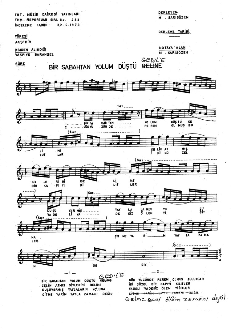 Bir sabahtan yolum düştü geline (Rep.No: 453)