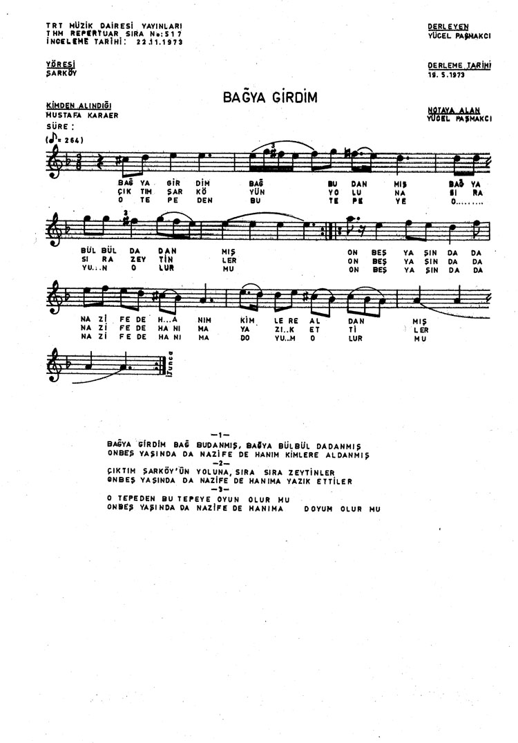 Bağya girdim bağ budanmış (Rep.No: 517)