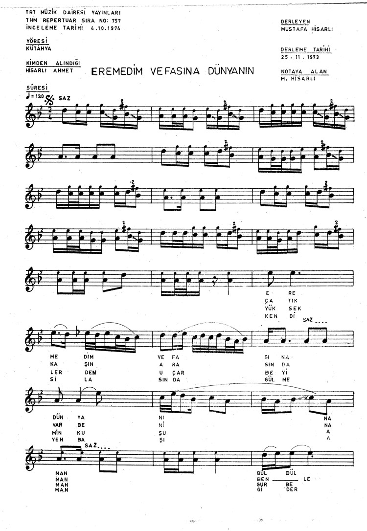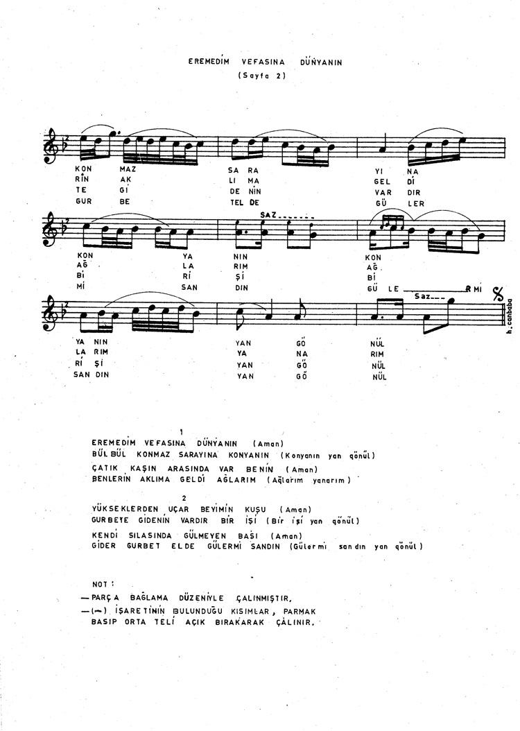 Bu türkünün notasında, sözlerinde veya örnek icrasında bir eksiklik yahut yanlışlık tespit ederseniz, e-mail ile veya WhatsApp hattından bildirim yaparak katkıda bulunabilirsiniz.