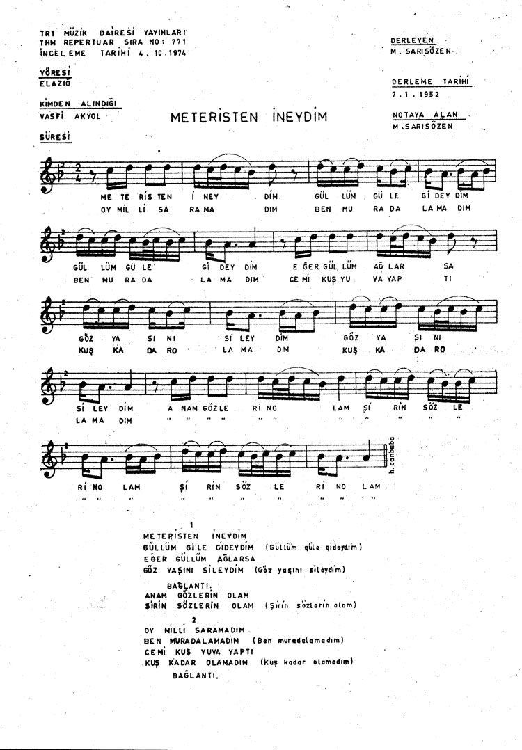 Bu türkünün notasında, sözlerinde veya örnek icrasında bir eksiklik yahut yanlışlık tespit ederseniz, e-mail ile veya WhatsApp hattından bildirim yaparak katkıda bulunabilirsiniz.