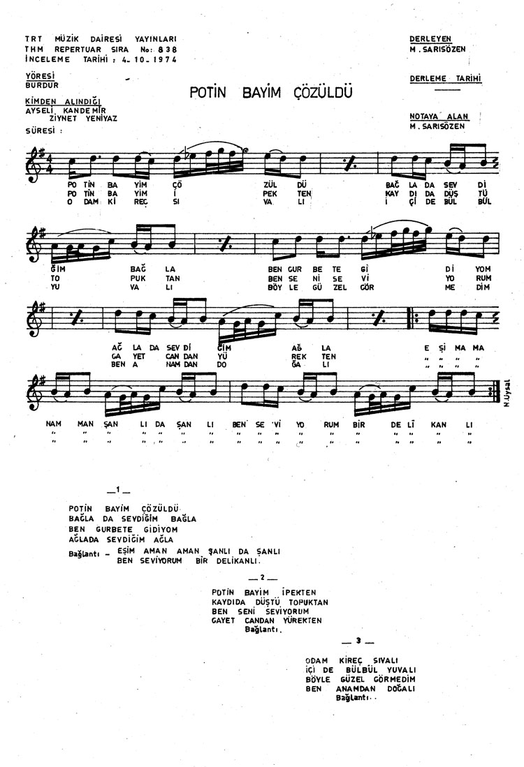 Bu türkünün notasında, sözlerinde veya örnek icrasında bir eksiklik yahut yanlışlık tespit ederseniz, e-mail ile veya WhatsApp hattından bildirim yaparak katkıda bulunabilirsiniz.