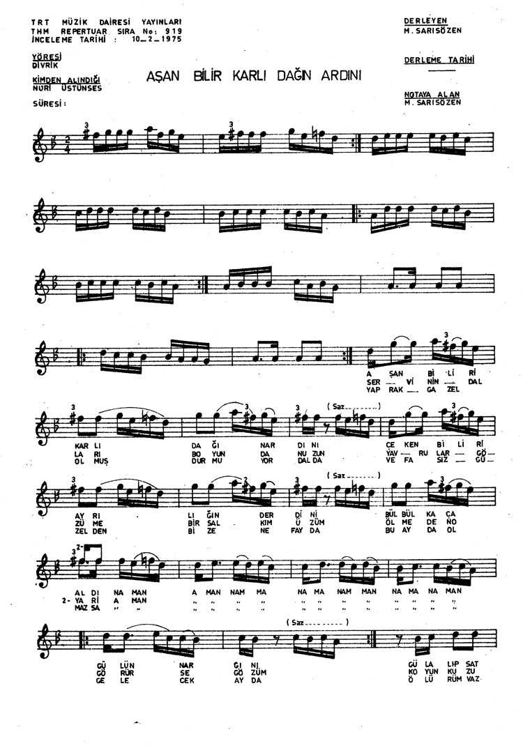 Aşan bilir karlı dağın ardını (Rep.No: 919)