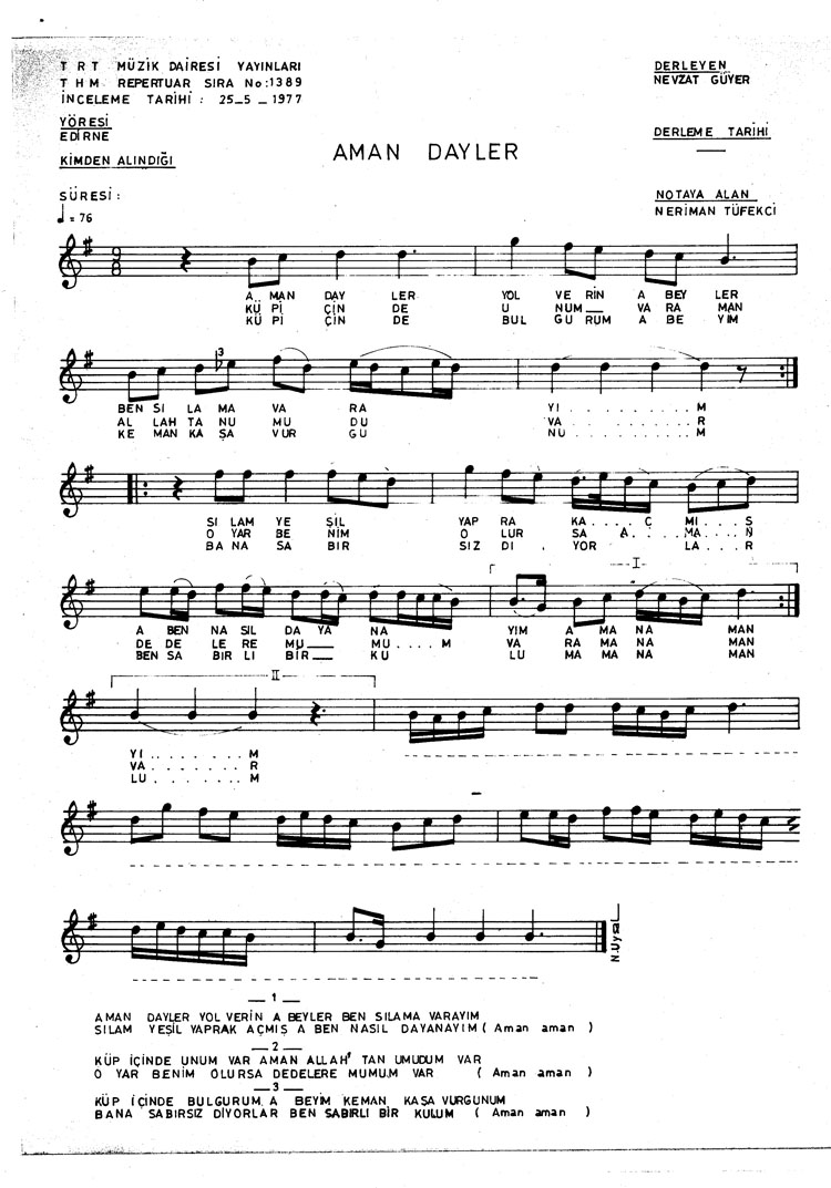 Aman dayler yol verin a beyler (Rep.No: 1389)