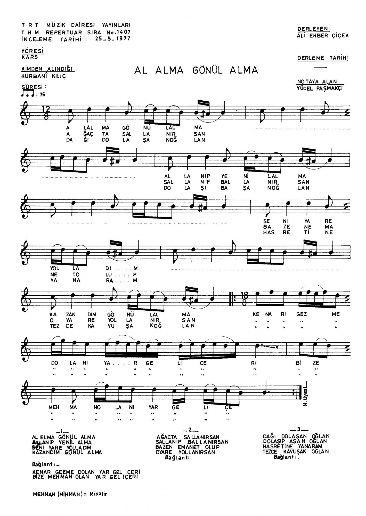 Bu türkünün notasında, sözlerinde veya örnek icrasında bir eksiklik yahut yanlışlık tespit ederseniz, e-mail ile veya WhatsApp hattından bildirim yaparak katkıda bulunabilirsiniz.