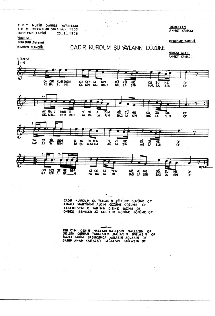Çadır kurdum şu yaylanın düzüne (Rep.No: 1503)