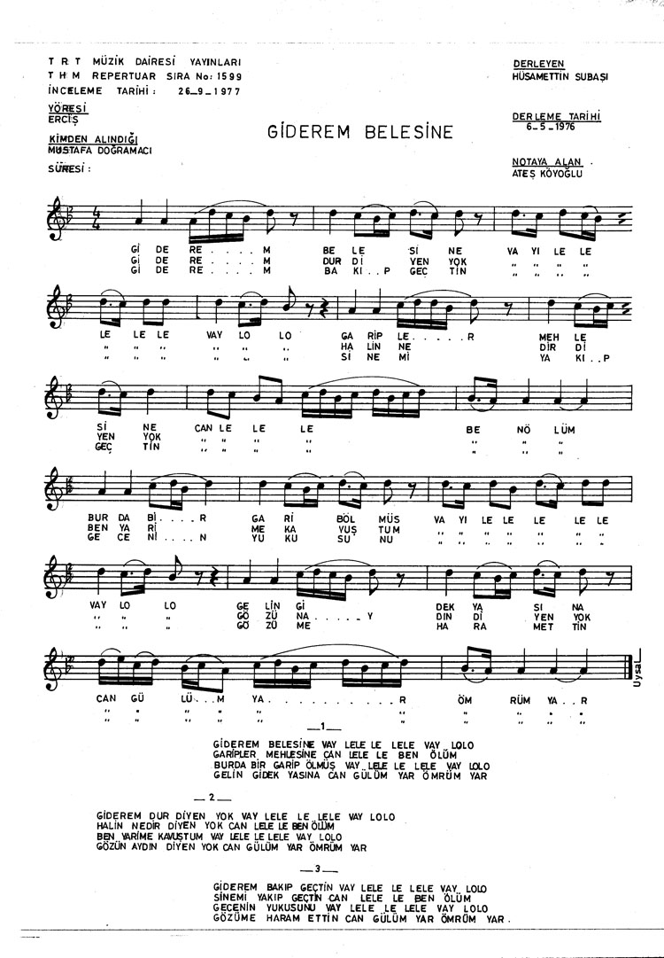 Bu türkünün notasında, sözlerinde veya örnek icrasında bir eksiklik yahut yanlışlık tespit ederseniz, e-mail ile veya WhatsApp hattından bildirim yaparak katkıda bulunabilirsiniz.