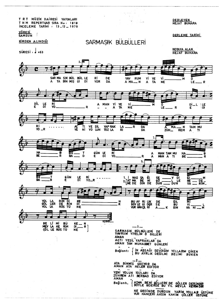 Bu türkünün notasında, sözlerinde veya örnek icrasında bir eksiklik yahut yanlışlık tespit ederseniz, e-mail ile veya WhatsApp hattından bildirim yaparak katkıda bulunabilirsiniz.