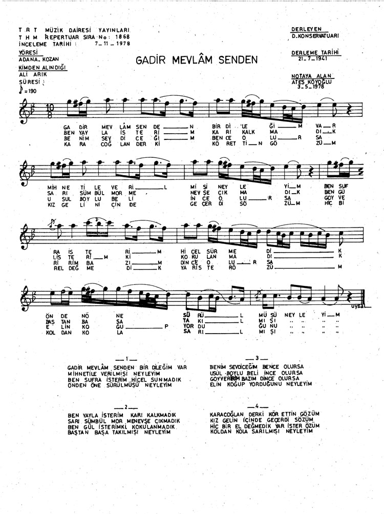 Bu türkünün notasında, sözlerinde veya örnek icrasında bir eksiklik yahut yanlışlık tespit ederseniz, e-mail ile veya WhatsApp hattından bildirim yaparak katkıda bulunabilirsiniz.