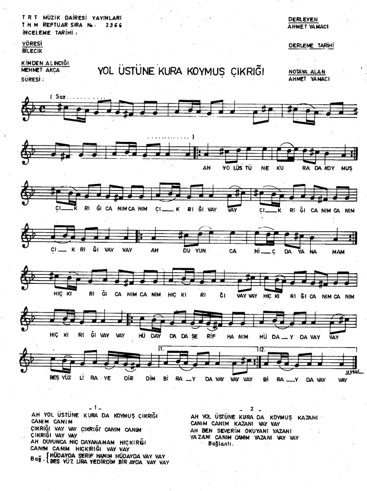 Bu türkünün notasında, sözlerinde veya örnek icrasında bir eksiklik yahut yanlışlık tespit ederseniz, e-mail ile veya WhatsApp hattından bildirim yaparak katkıda bulunabilirsiniz.