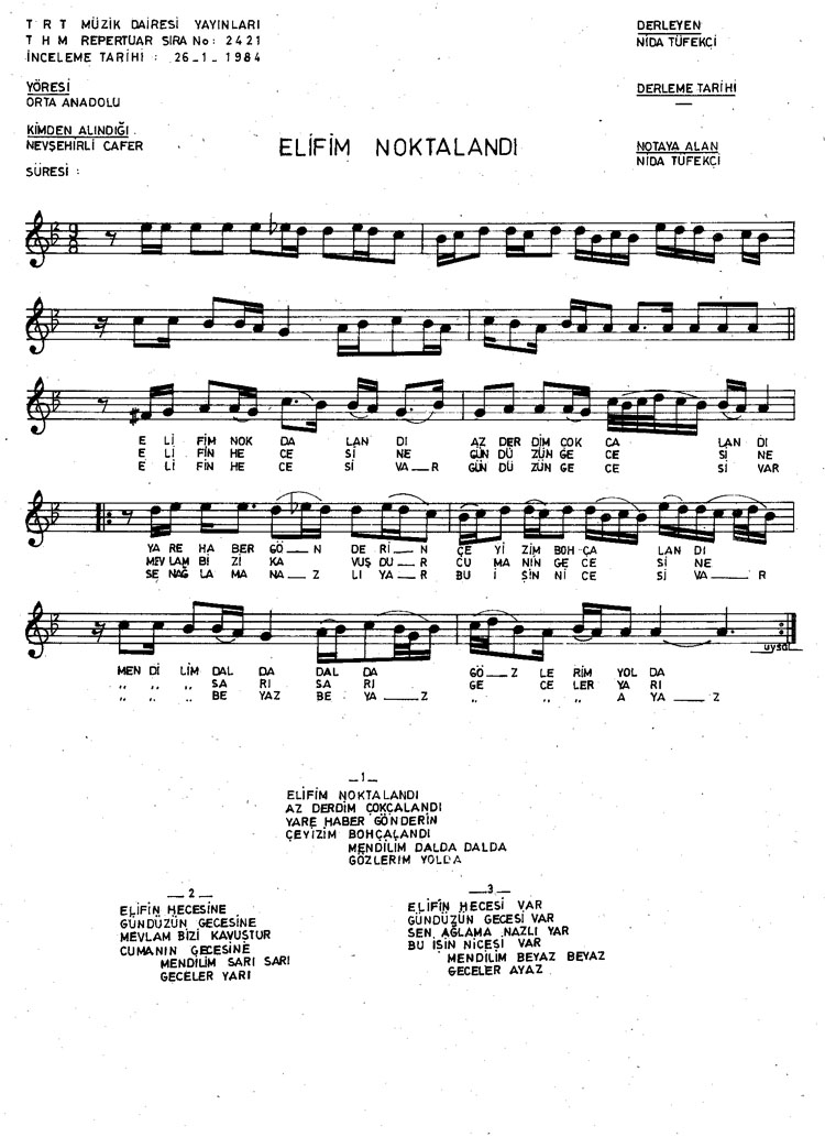 Bu türkünün notasında, sözlerinde veya örnek icrasında bir eksiklik yahut yanlışlık tespit ederseniz, e-mail ile veya WhatsApp hattından bildirim yaparak katkıda bulunabilirsiniz.