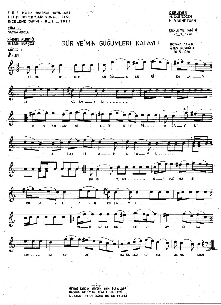 Bu türkünün notasında, sözlerinde veya örnek icrasında bir eksiklik yahut yanlışlık tespit ederseniz, e-mail ile veya WhatsApp hattından bildirim yaparak katkıda bulunabilirsiniz.