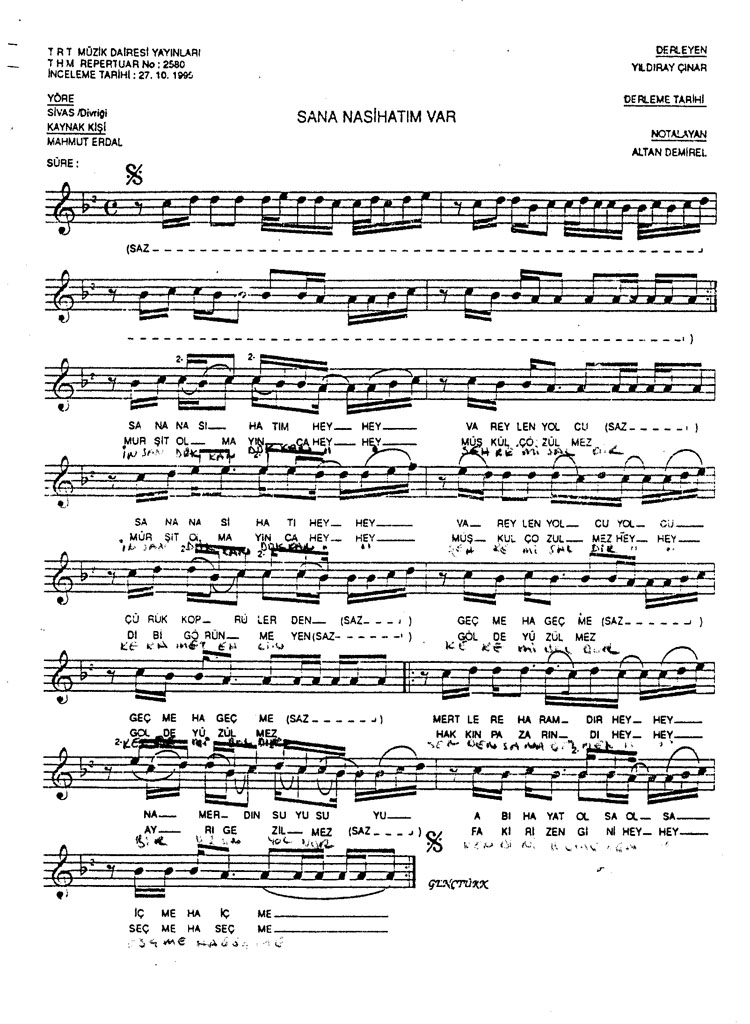 Bu türkünün notasında, sözlerinde veya örnek icrasında bir eksiklik yahut yanlışlık tespit ederseniz, e-mail ile veya WhatsApp hattından bildirim yaparak katkıda bulunabilirsiniz.