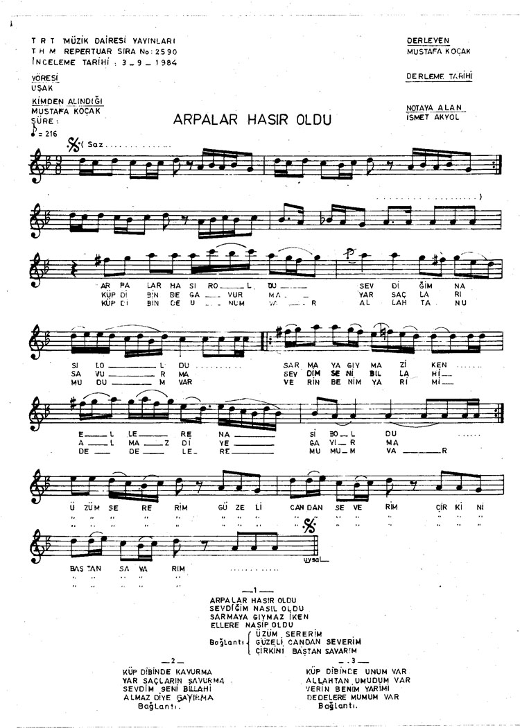 Bu türkünün notasında, sözlerinde veya örnek icrasında bir eksiklik yahut yanlışlık tespit ederseniz, e-mail ile veya WhatsApp hattından bildirim yaparak katkıda bulunabilirsiniz.