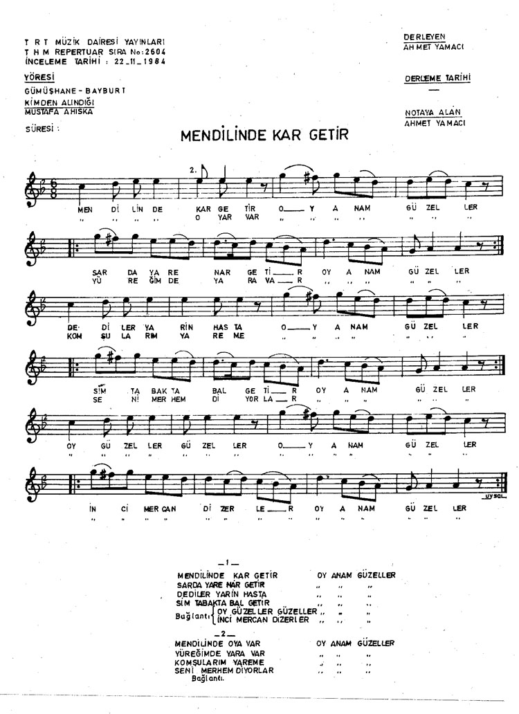 Bu türkünün notasında, sözlerinde veya örnek icrasında bir eksiklik yahut yanlışlık tespit ederseniz, e-mail ile veya WhatsApp hattından bildirim yaparak katkıda bulunabilirsiniz.