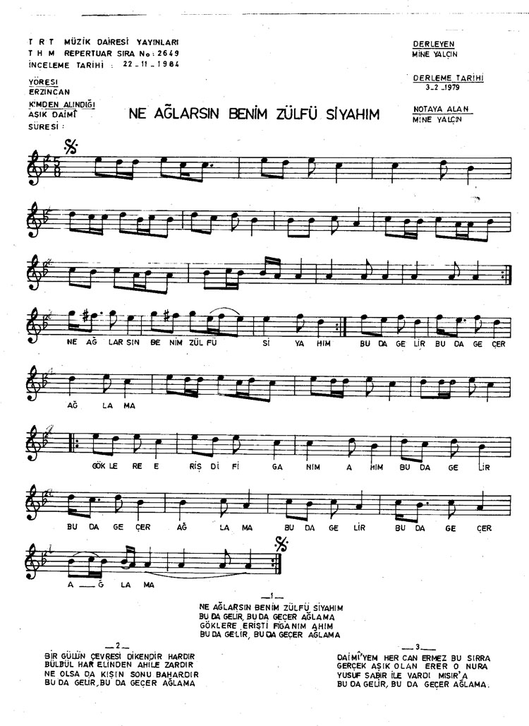 Ne ağlarsın benim zülfü siyahım (Rep.No: 2649)