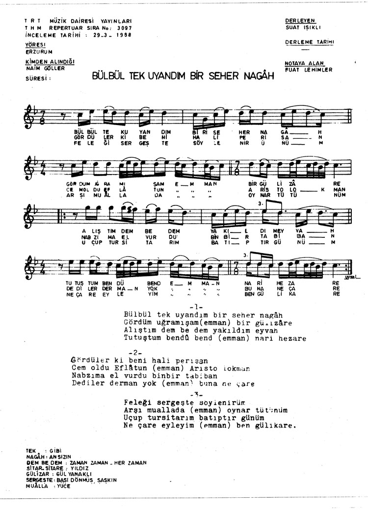 Bülbül tek uyandım bir seher nagah (Rep.No: 3097)