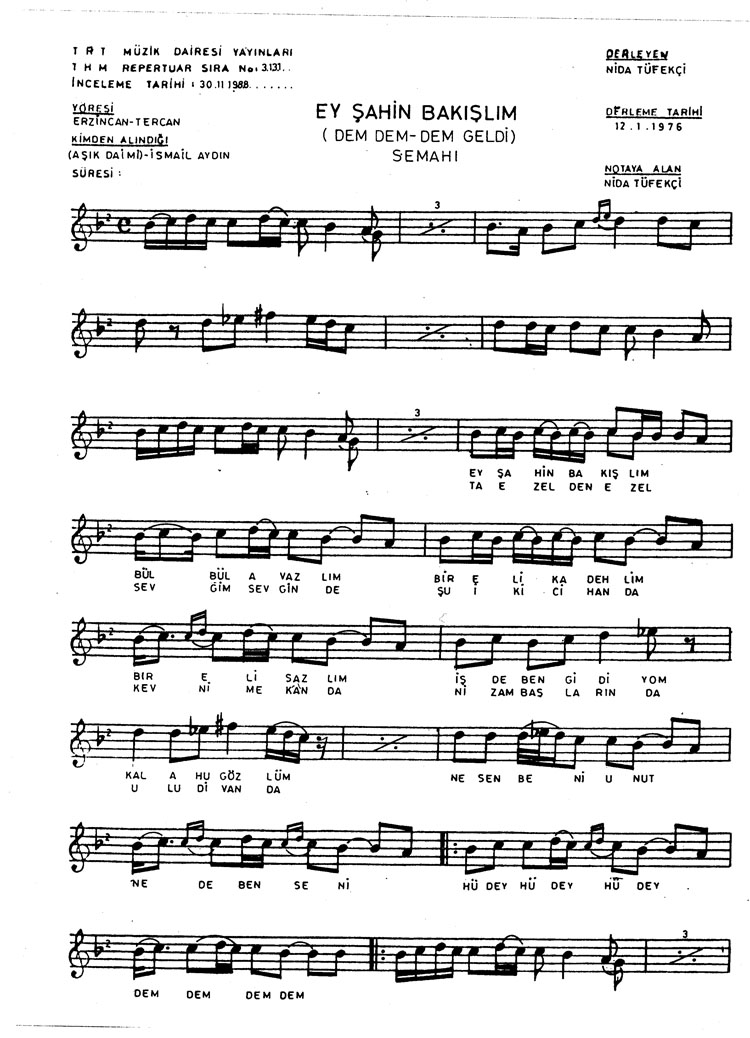 Ey şahin bakışlım (Dem geldi semahı) (Rep.No: 3131)