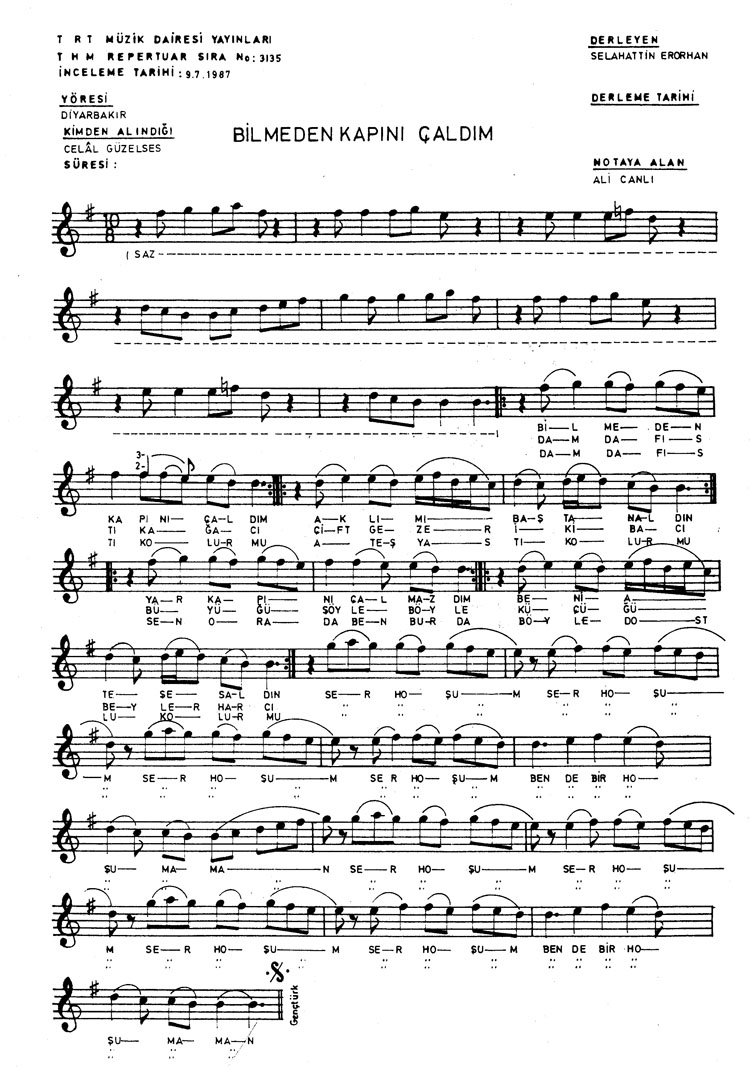 Bu türkünün notasında, sözlerinde veya örnek icrasında bir eksiklik yahut yanlışlık tespit ederseniz, e-mail ile veya WhatsApp hattından bildirim yaparak katkıda bulunabilirsiniz.