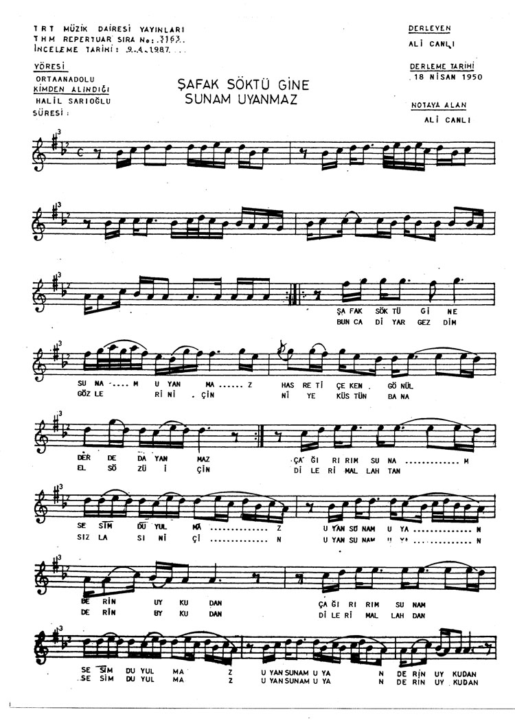 Şafak söktü gine sunam uyanmaz (Rep.No: 3163)