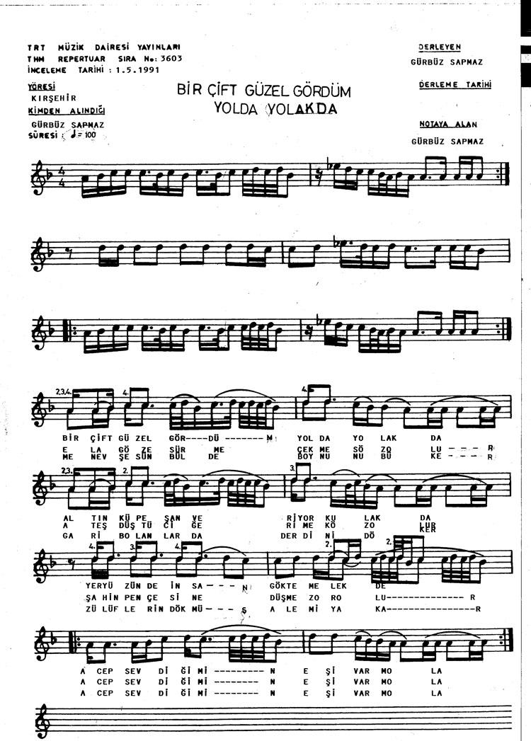 Bir çift güzel gördüm yolda yolakta (Rep.No: 3603)