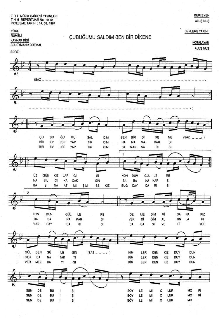 Bu türkünün notasında, sözlerinde veya örnek icrasında bir eksiklik yahut yanlışlık tespit ederseniz, e-mail ile veya WhatsApp hattından bildirim yaparak katkıda bulunabilirsiniz.