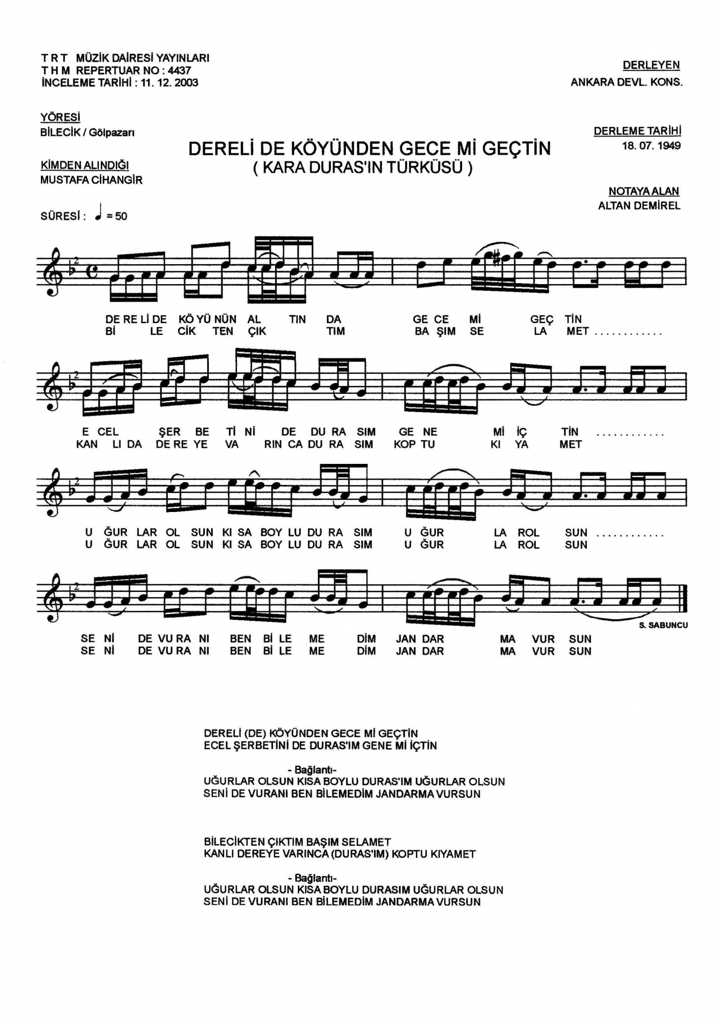 Dereli de köyünden gece mi geçtin (Rep.No: 4437)