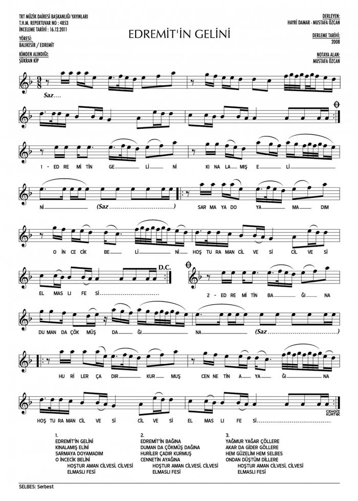 Bu türkünün notasında, sözlerinde veya örnek icrasında bir eksiklik yahut yanlışlık tespit ederseniz, e-mail ile veya WhatsApp hattından bildirim yaparak katkıda bulunabilirsiniz.