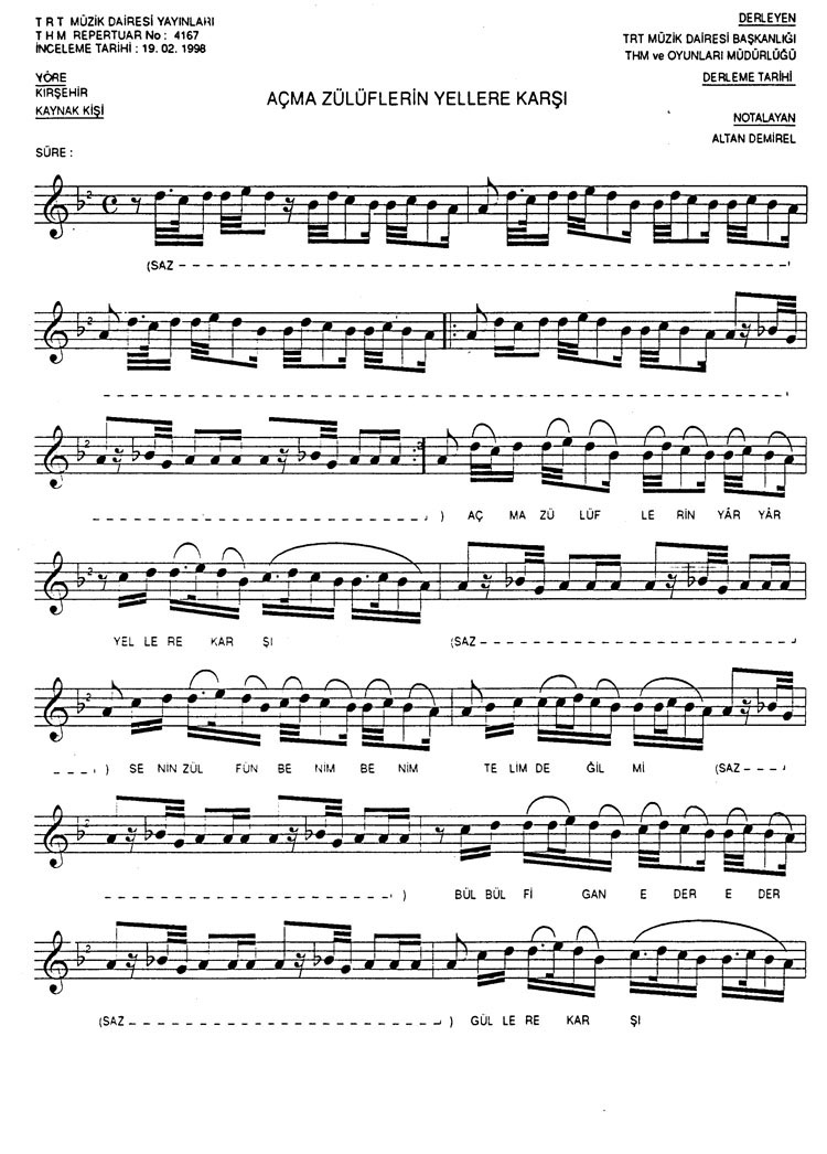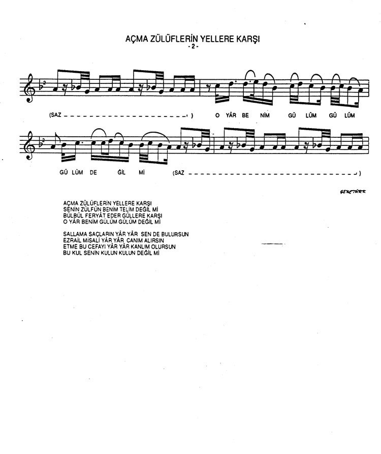 Yurttan seslerTürküler geçidi Bu türkünün notasında, sözlerinde veya örnek icrasında bir eksiklik yahut yanlışlık tespit ederseniz, e-mail ile veya WhatsApp hattından bildirim yaparak katkıda bulunabilirsiniz. Açma zülüflerin yellere karşı Senin zülfün benim telim değil mi Bülbül feryat eder güllere karşı O yar benim gülüm değil mi Sallama saçların (yar yar) sen de bulursun Ezrail misali (yar yar) canım alırsın Etme bu cefayı (yar yar) kanlım olursun Bu kul senin kulun değil mi Bu türküyü paylaşabilirsiniz.